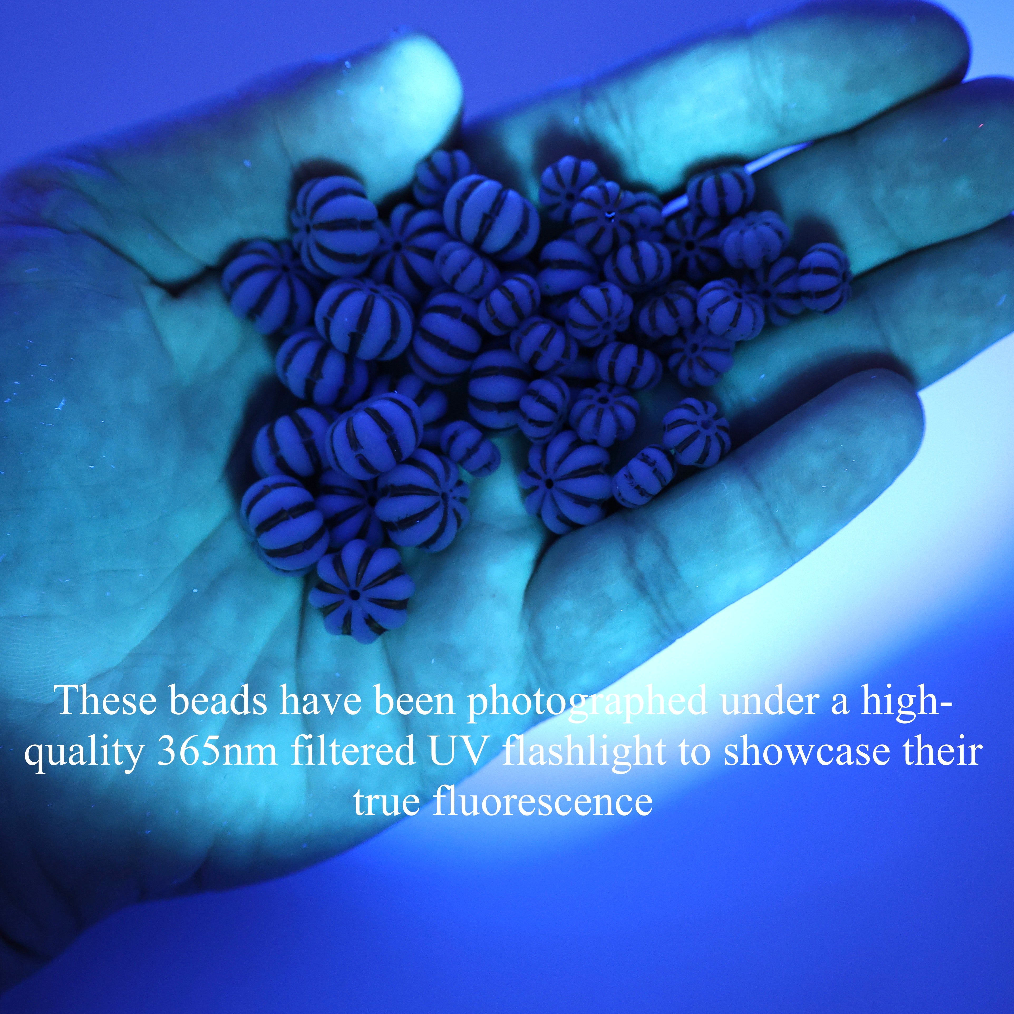 These beads have been photographed under a high-quality 365nm filtered UV light to showcase their true fluorescence. Please be aware that not all UV lights produce the same results — lower wavelength accuracy, visible purple light, or unfiltered LED flashlights may not trigger the same glow effect seen in our photos. For best results, we recommend using a 365nm UV light with a filter lens (like uvBeast or professional-grade UV flashlights). This helps avoid confusion and ensures you're getting the full experience these beads have to offer!